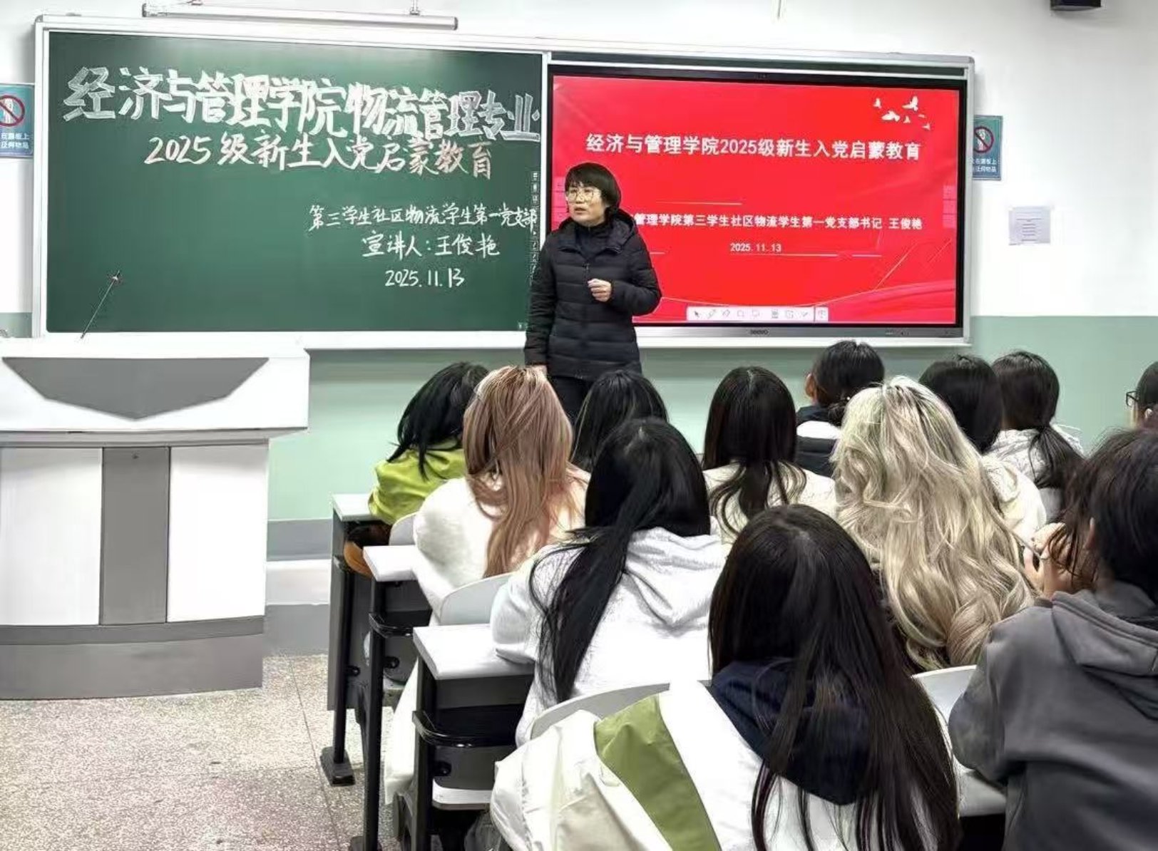 2025年11月13日晚上,经济与管理学院第三学生社区物流学生第一党支部书记王俊艳在河西校区16号楼302教室面向物流管理专业2025级新生开展入党启蒙教育。本次讲座旨在引导新生了解中国共产党,激发他们的入党热情,培养他们成为新时代的接班人。