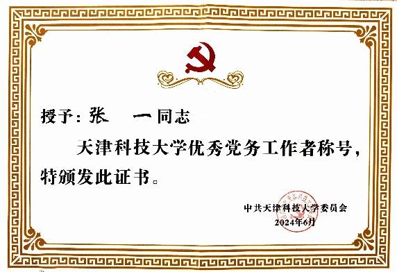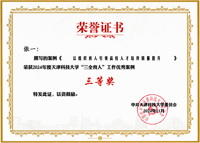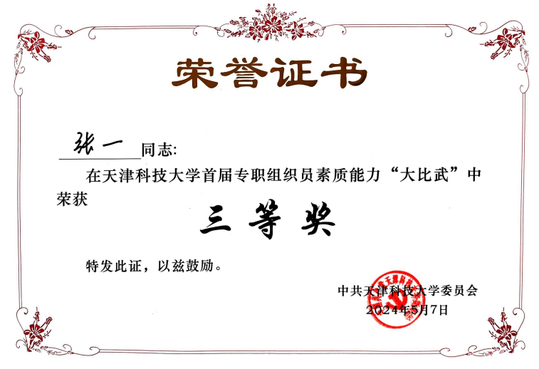 建设过程中,组织员导航站负责人张一同志获得天津科技大学首届专职组织员素质能力“大比武”三等奖、“天津科技大学优秀党务工作者”、校级“三全育人”工作优秀案例三等奖等荣誉。